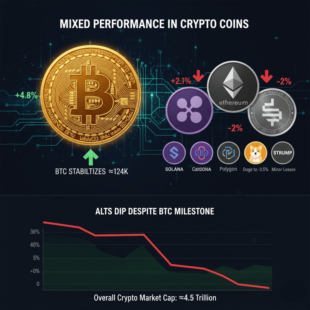 Bitcoin’s price stabilized slightly above $124,000, while the overall cryptocurrency market capitalization surpassed $4.5 trillion, indicating continued market depth despite short-term volatility in some tokens.