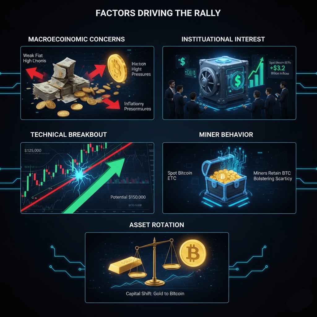 Several macroeconomic and market dynamics are supporting Bitcoin’s sustained rally and its effect on crypto stocks: